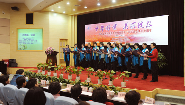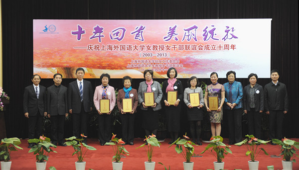 2013年4月11日是女教授女干部联谊会成立十周年的日子。十年来,上外女教授女干部联谊会满足了我校知识女性更高层次的发展需求,以凝聚精华、增进友谊、加强交流、提升自我、促进成才、贡献社会为宗旨,为女教授女干部们创设了展示自我,服务他人,提升自我,交流互动的平台和舞台,取得了令人瞩目的成就。 “女性成才全程护导计划”给包括女大学生在内的全体上外女性提供职业生涯指导;多语种志愿者服务队,展示了上外女教师的厚德博学,为农民工子弟学校捐建阳光书屋体现了上外女教师的社会责任。“终身会员”理念,给资深会员们以充分的关爱和信任。2005年、2007年联谊会两次获得上海市教育系统妇女工作品牌示范点。2011年上海教师世博多语种志愿者服务队获全国巾帼文明岗和上海市五一劳动奖状等多项殊荣,为学校争得了荣誉,展现出我校女教授女干部们爱岗奉献、建功立业的卓越风采。