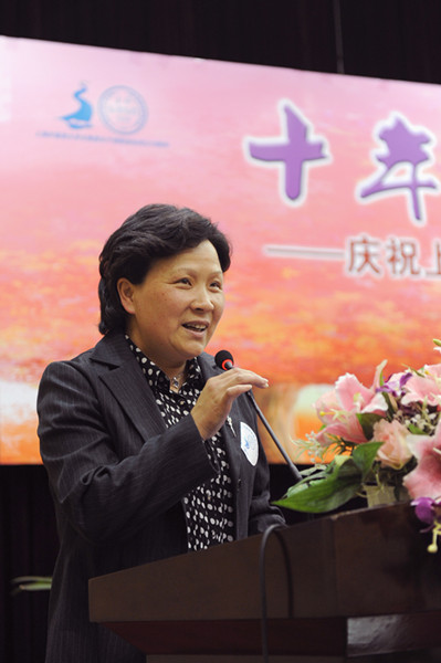 夏玲英主席,被整个大会深深感染,她赠予上外女教授女干部联谊会以最美好的话语,并为《十年回首 美丽绽放》文集寄语,她说,在上海教育的百花园中,盛开着一簇艳丽夺目的奇葩:她们以精湛国际语言、学识魅力,活跃在上海这座开放的城市,打造着外语教学的优秀品牌;她们以崇高的师德、人格魅力,培育着深受青睐的大学生;她们以技压群芳的水平摘走了“教师为世博添光彩”双语竞赛的桂冠,又以款款动人的旗袍秀在上海女教师风采展示中赢得一片赞叹。这簇艳丽夺目的奇葩,就是上外女教授女干部!这个屡创佳绩的群体,就是上外女教授女干部联谊会!夏主席用最美丽的语言赞美联谊会这个独特的群体,寄语她最美好的未来。
