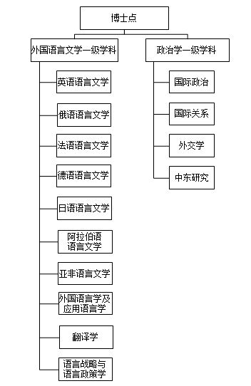 至2013年12月,学校有2个一级学科博士点(外国语言文学、政治学),14个二级学科博士点(英语语言文学、俄语语言文学、法语语言文学、德语语言文学、日语语言文学、阿拉伯语语言文学、亚非语言文学、外国语言学及应用语言学、翻译学、国际政治、国际关系、外交学、中东研究、语言战略与语言政策学)。