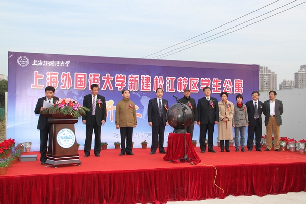 曹德明宣布:上外新建松江校区学生公寓项目正式开工! 曹德明、李月松、王静、冯庆华、周承等上外领导和施工单位负责人共同启动了松江校区学生公寓建设奠基仪式。