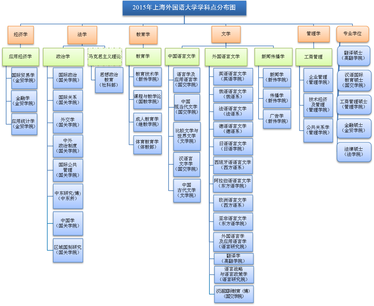 2015年,学校学科建设稳步发展,成绩显著。外国语言文学学科入选上海市21个I类高峰学科建设计划。学校学科布局更加优化,学科内涵进一步凝练。为对接国家《统筹推进世界一流大学和一流学科建设总体方案》要求和上海市I类高峰学科建设要求,强化学科内涵建设,理顺学科建设机制。为加强马克思主义理论学科建设,完善学科布局,增强学科交叉融合力,成立马克思主义学院。完成校学术委员会换届选举,建立新一届校学术委员会和4个专门委员会。成立了外国语言文学一级学科学术委员会,推出外国语言文学一级学科建设管理机制。启动“十三五”规划编制工作。