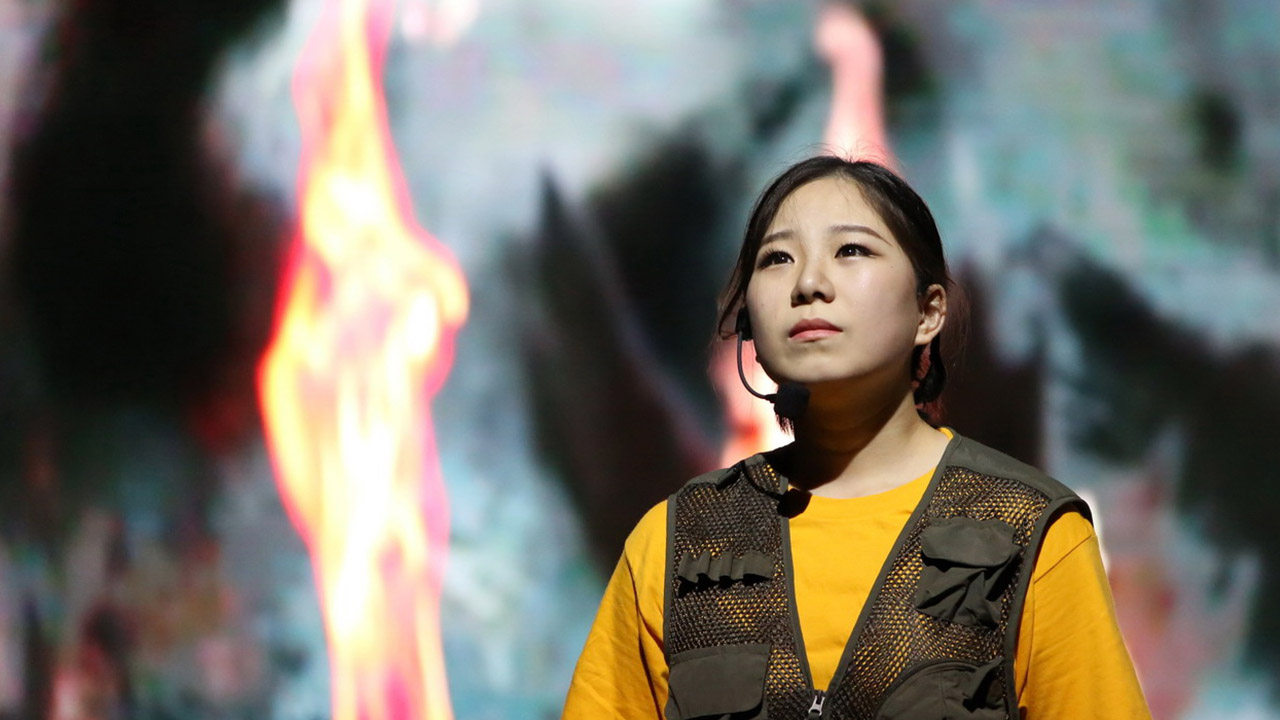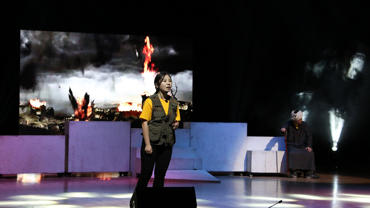 开学典礼仪式结束后,校领导和全体新生共同观看了大学生艺术团表演的音乐短剧《战地蔷薇》。这部音乐剧的创作灵感来自于我校东方语学院阿语系2009届校友王薇薇的真实经历。她作为中央电视台战地记者,在硝烟弥漫、战火纷飞的的叙利亚街头进行新闻报道的事迹曾在网络引起热议。这部音乐短剧所表现的“让每个青年都有梦想,让每个青春都能绽放”的主题,正是对于“青年梦”、“中国梦”的叩问与思考,也提示了在座新生“大学之道 青春之路”的行走方式。为了这次演出,已经毕业的校友艾力迪亚·阿尔斯郎、沈道灵特地远道而来,和其他在校演员共同为2016级新生献上了一场精彩的演出。演出尾声,伴着校歌的激昂歌声,由校棒球队学生组成的旗队将舞台装点成旗帜的海洋,舞动的国旗与校旗将全场的气氛推向了高潮。