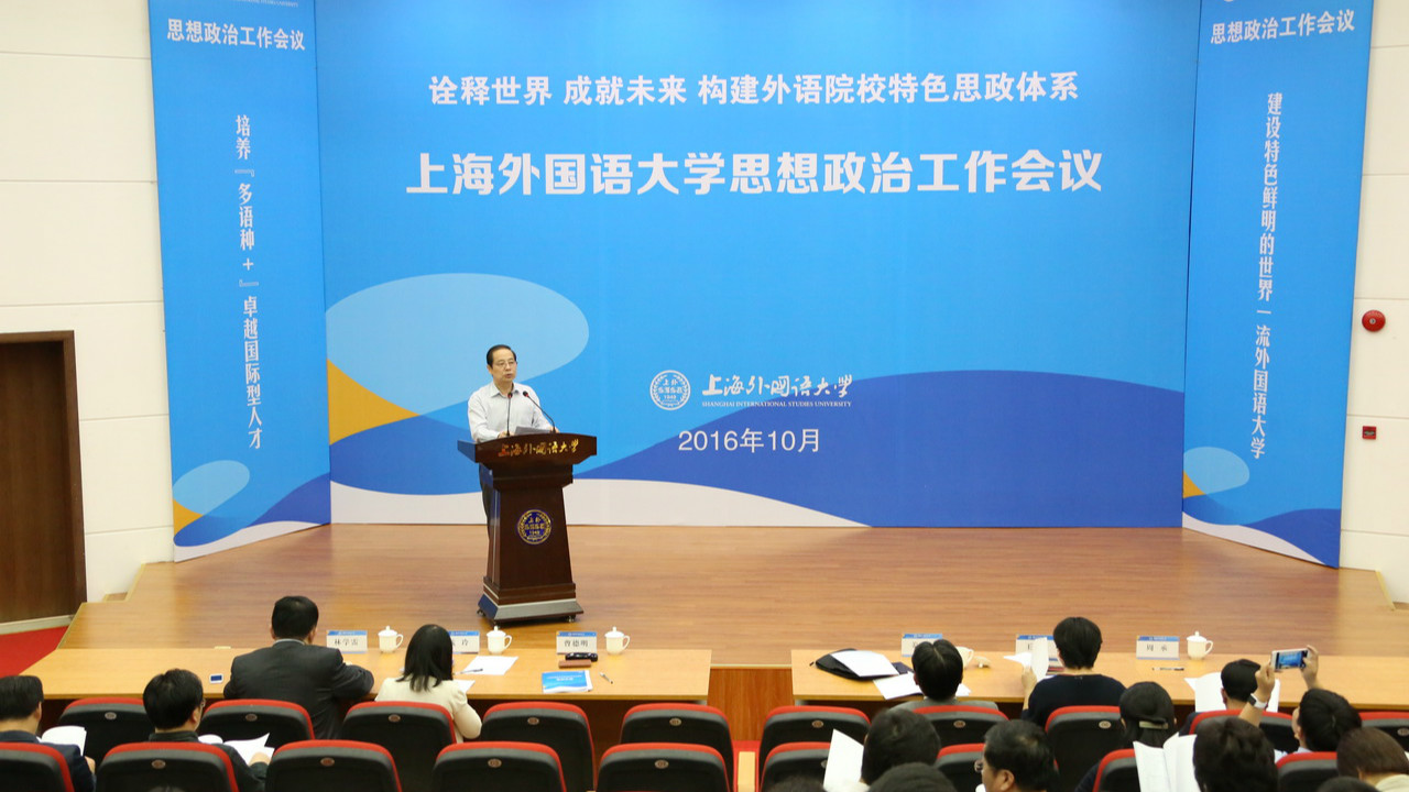 会议回顾了近三年来学校在推进外语院校特色思政工作体系方面取得的成果,包括坚持“办网以育人为宗旨、育人以办网为平台”,建设了多语种外文门户网站;成立马克思主义学院,确立了学科研究五大主攻方向;把专业教学与思想政治教育有机融合,在思想政治理论课、外文专业课、选修课程中探索教学改革;《跨文化交际》在慕课平台上线并第三次开放选课、首届中国学全英文硕士项目研究生顺利毕业;发挥实践育人作用,突出外语特色,促进中外人文交流,全国青联文化研究与传播基地落户上外、“青年外交”实践育人平台初见成效、多语种学生志愿者服务队参与保障各类重大国际会议。
