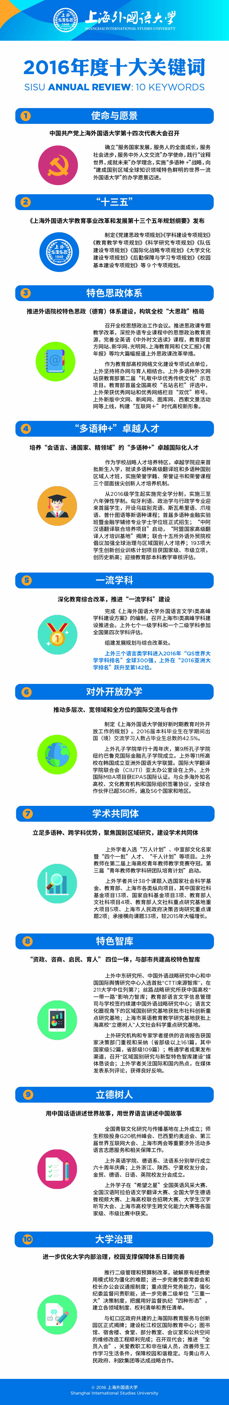 【摄影 | SISU Communications】 编者按:新年的钟声即将敲响,难忘的2016年即将过去,更加充满希望的2017年正向我们走来。2016是“十三五”开局之年,召开了第十四次党代会,发布了“十三五”规划,稳妥推进教育综合改革。年终岁末总结之际,上外官方微信平台微校刊《西索》发布十大关键词,带你盘点我们一同走过的2016年。