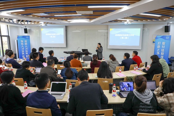 4月15日 ,2019年第二期慕课建设与应用工作坊在松江校区行政楼卓越学院129室举行。李岩松校长、国家精品在线开放课程负责人冯庆华教授和张红玲教授、教务处姜智彬处长、国际教育学院金慧教授、各本科教学单位党政负责人和主管教学副职、5支校内外拍摄制作团队,以及来自全校各院系部门共70多位教师参加了本次工作坊。教务处副处长王会花主持工作坊。