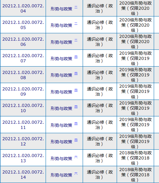 2.2018、2019、2020级学生培养方案中“形势与政策”为1-8学期连续课程,每学期8学时,请同学们注意上课时间,按时选课,留意课程名称右侧的对应数字,如二、四、六: