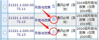(3)“形势与政策”为1-8学期连续课程,每学期8学时,请同学们注意上课时间,按时选课,留意课程名称右侧的对应数字;