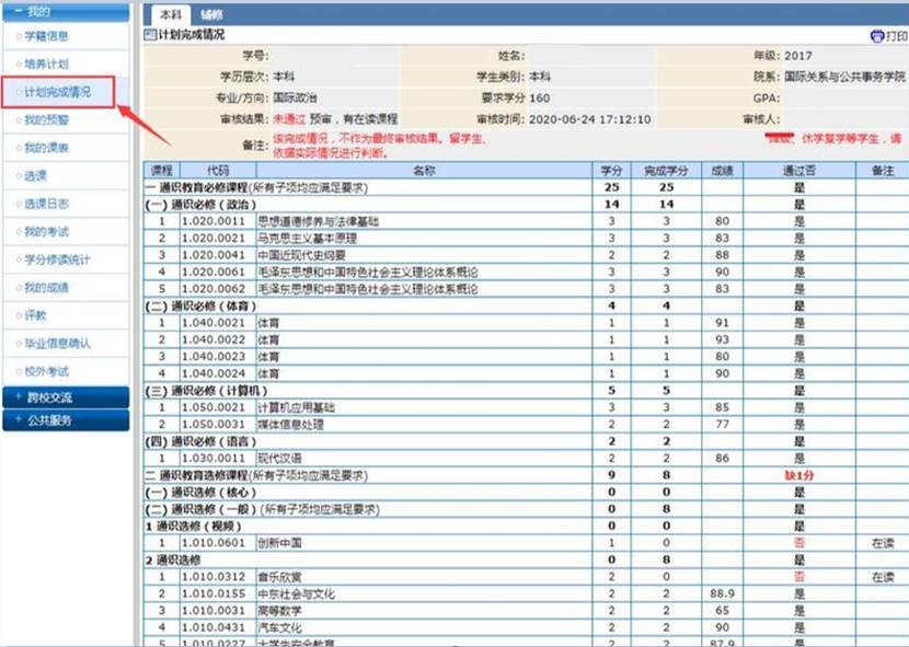 (2)选课前和选课过程中,请仔细研究自己的计划完成情况,参照 “我的”—“计划完成情况”如下图: